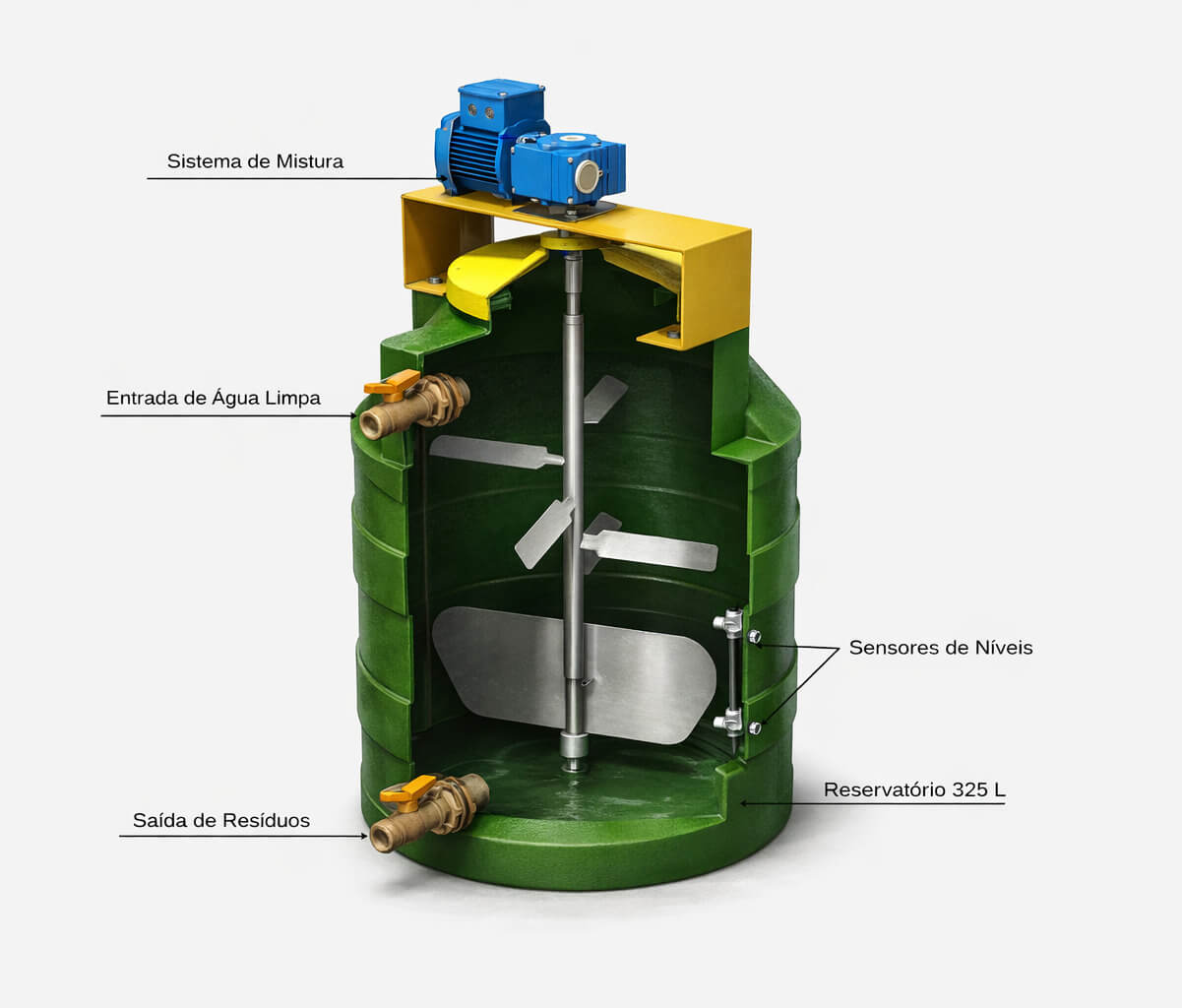 O equipamento é composto por um reservatório em polietileno de alta resistência e um sistema de agitação mecânica com pás metálicas. O preparo inicial da solução é realizado manualmente, com a introdução de água e do produto químico nas proporções definidas para o processo.